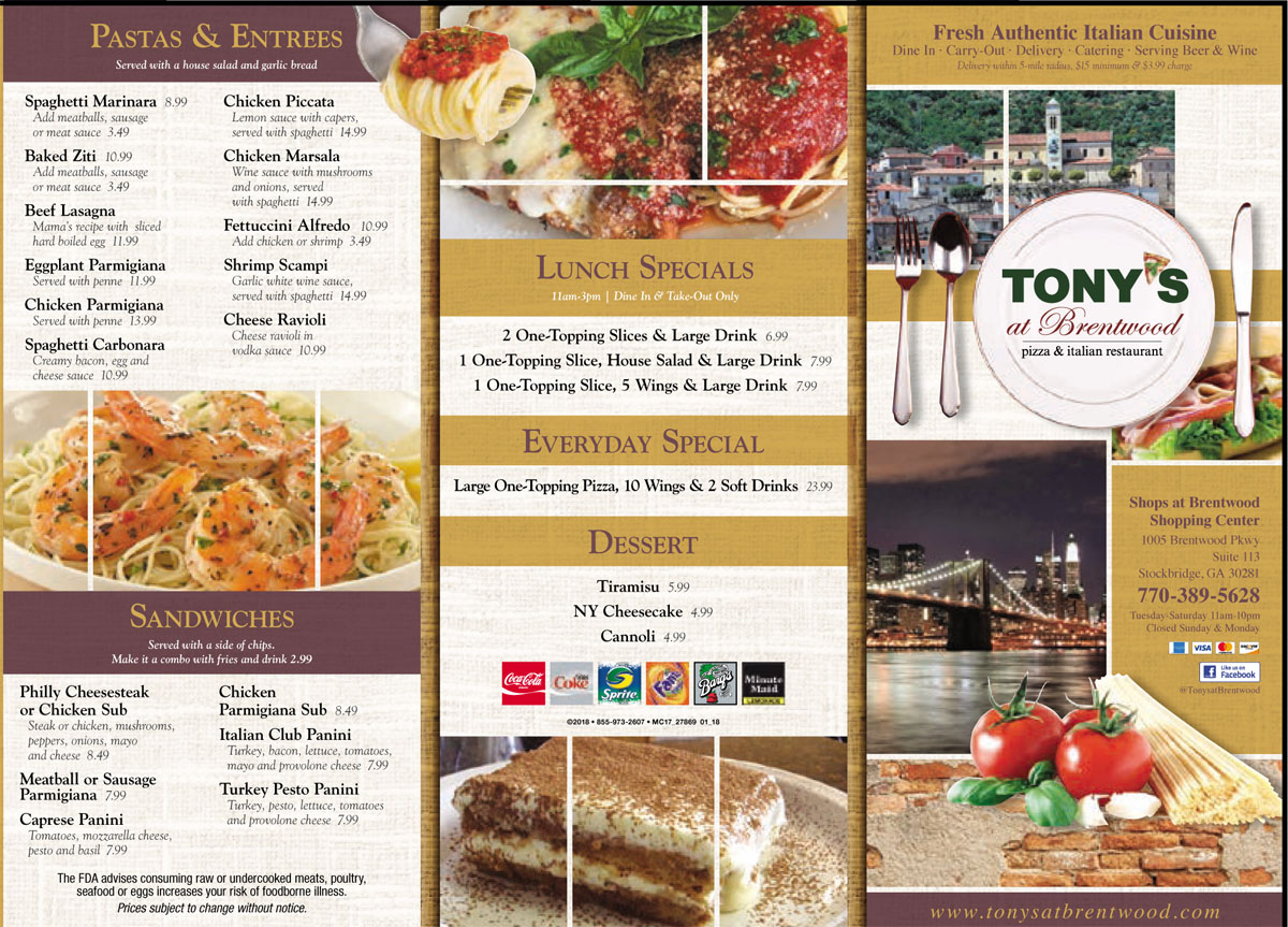 At Tony's At Brentwood Menu, you’ll find a variety of flavorful dishes that are perfect for any meal. Located at 1005 Brentwood Pkwy #113 in Stockbridge, GA, this spot offers a welcoming atmosphere where you can enjoy classic comfort food with a twist. From delicious appetizers to hearty entrees, the menu is designed to satisfy a wide range of tastes. Whether you're in the mood for savory pastas, crispy fried favorites, or fresh salads, there’s something for everyone. The vibrant flavors and quality ingredients make every meal feel special. So whether you’re grabbing a quick bite or sitting down for a leisurely dinner, Tony's has the perfect option to make your visit a satisfying experience.